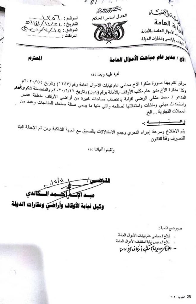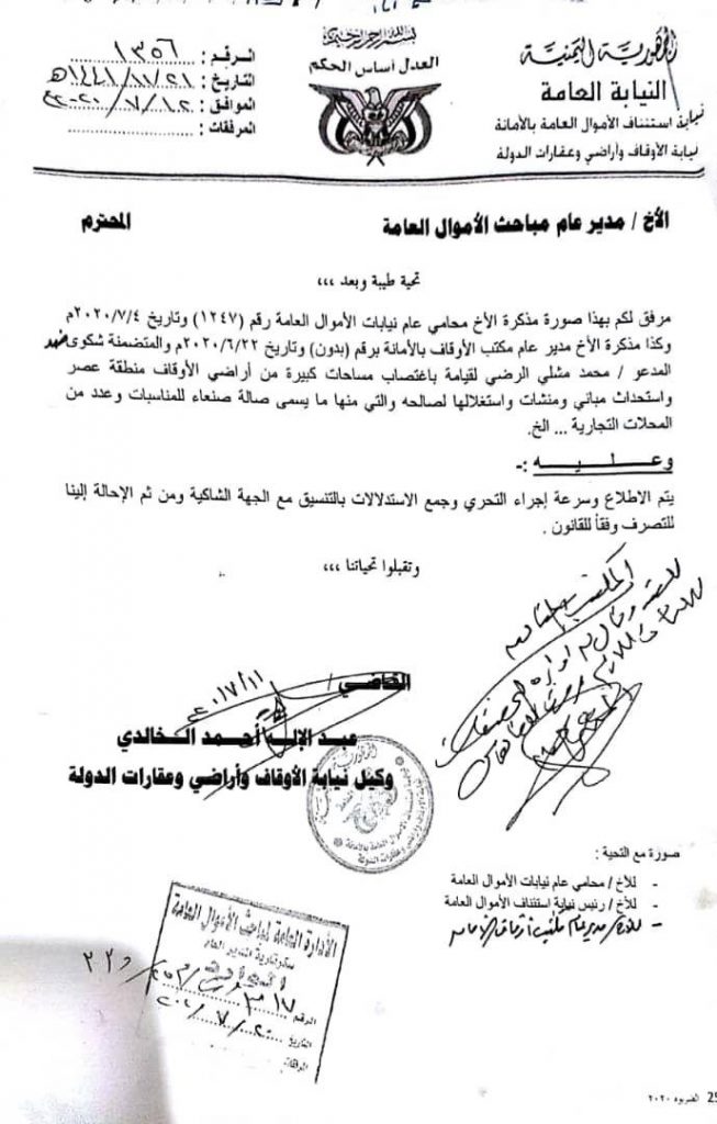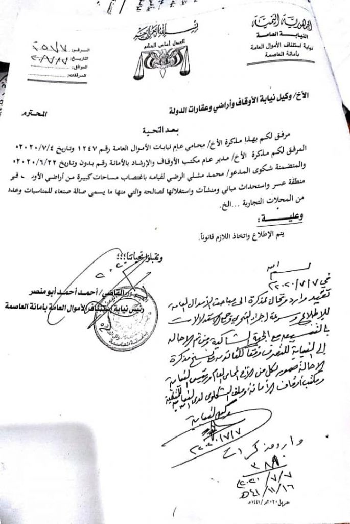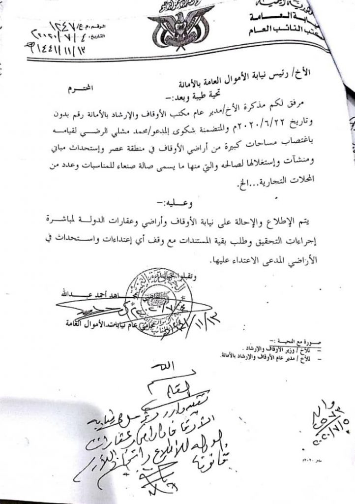 وأحال محامي الأموال العامة في مذكرته رقم 1247 بتاريخ 4 /7/ 2020م شكوى تقدم بها مكتب الأوقاف والأرشاد بأمانة العاصمة بشأن قيام البرلماني محمد مشلي الرضي بالبسط والاغتصاب لمساحات كبيرة من أراضي الأوقاف الكائنة بعصر واستحداثه ما تسمى بصالة صنعاء للمناسبات وعدد من المحال التجارية-الى رئيس نيابة الأموال العامة الذي احالها بدوره الى رئيس نيابة الأوقاف وأراضي وعقارات الدولة ومن ثم مباحث الأموال العامة لإجراء التحري والتصرف وفقا للقانون بموجب جمع الاستدلالات مع الجهة الشاكية.
