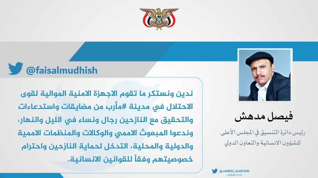 وأدان رئيس دائرة التنسيق بالمجلس الأعلى فيصل مدهش ما تقوم به الاجهزة الامنية الموالية لقوى الاحتلال في مدينة مأرب من مضايقات واستدعاءات والتحقيق مع النازحين رجال ونساء في الليل والنهار.