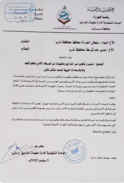 وكشفت وثيقة موجهه الى محافظ مارب الموالي للعدوان سلطان العرادة تلقي الوحدة التنفيذية لإدارة مخيمات النازحين عدة شكاوي من أسر النازحين بالمخيمات تفيد بتعرض العديد من النساء لمضايقات واستدعاءات ليلية بحجة التحقيقات، او مايسمى بإجراءات أمنية من قبل قوات أمنية مسلحة بقيادة المدعو عبدالغني الشعلان.
