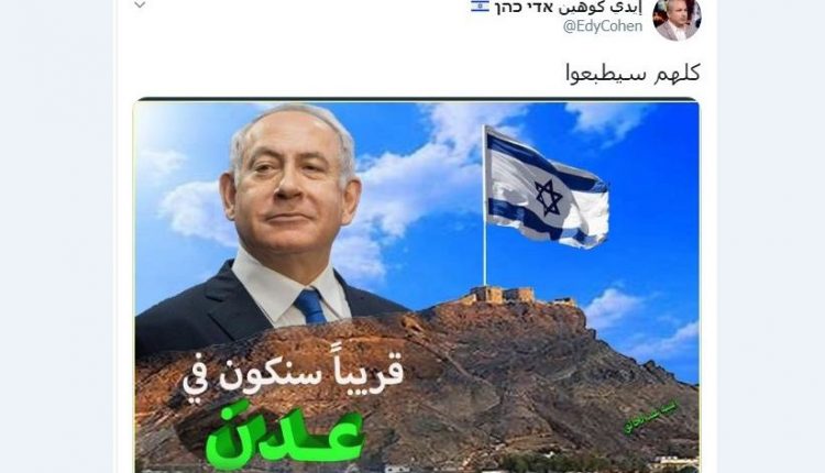 ونشر كوهين في صفحته بتويتر صورة لقلعة صيرة، عليها العلم الاسرائيلي وصورة لنتنياهو، كتب عليها ” قريبا سنكون في عدن”.