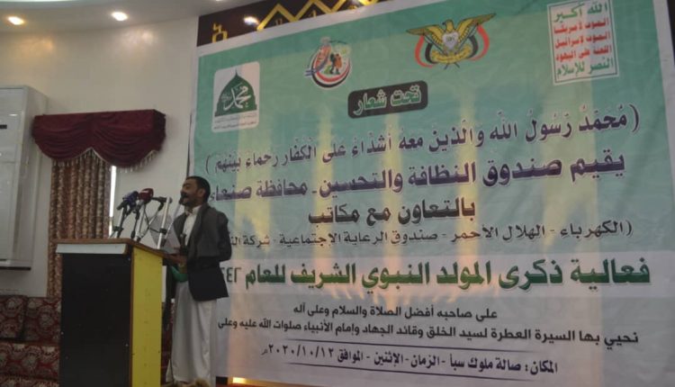 أقيمت بمحافظة صنعاء اليوم فعالية خطابية في ذكرى المولد النبوي نظمها صندوق النظافة والتحسين بالتعاون مع فرع مؤسسة الكهرباء وجمعية الهلال الأحمر اليمني وصندوق الرعاية الاجتماعية وفرع شركة النفط بالمحافظة.