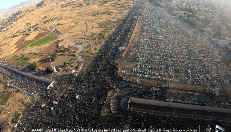 وثقت صورة جوية، التقطتها طائرة بدون طيار، جانب للحشود المليونية المشاركة في الاحتفال بمناسبة المولد النبوي الشريف في ميدان السبعين بالعاصمة صنعاء.