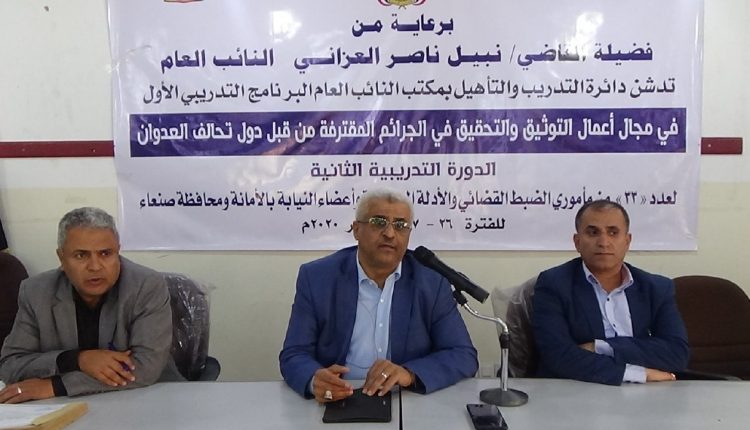 وكان 33 متدربا من مأموري الضبط القضائي والأدلة الجنائية وأعضاء النيابة بالأمانة ومحافظة صنعاء، تلقوا على مدي يومين تدريبات نظرية وتطبيقية في مجال أعمال التوثيق والتحقيق في الجرائم المقترفة من قبل دول التحالف.