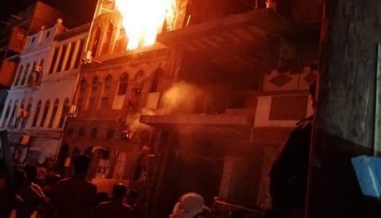وافاد شهود عيان أن الحريق أندلع في المبنى الواقع في سوق الكدر بمدينة كريتر التاريخية، خلف أضرارا فادحة في المبنى.