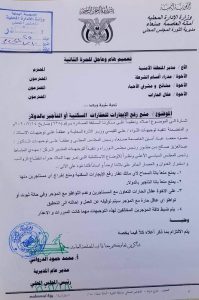 وجاء في مذكرة التعميم، حصل موقع يمانيون على نسخة منها، إشارة إلى الموضوع اعلاه وتعقيباً على مذكرتنا السابقة الصادرة برقم (638) بتاريخ 2020/7/14 والمتضمنة تنفيذ توجيهات اللواء/ علي القيسي وزير الإدارة المحلية