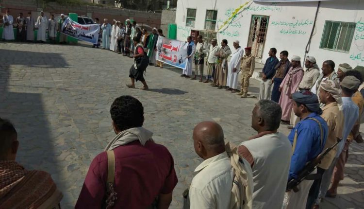 وفي الوقفة أوضح نائب مدير مكتب الأوقاف بالمحافظة عبدالرحمن الورفي أن الوقفة تأتي ضمن نشاط المكتب للتنديد بجرائم العدوان بحق الشعب اليمني وتأييدا وإسنادا للجيش واللجان الشعبية.