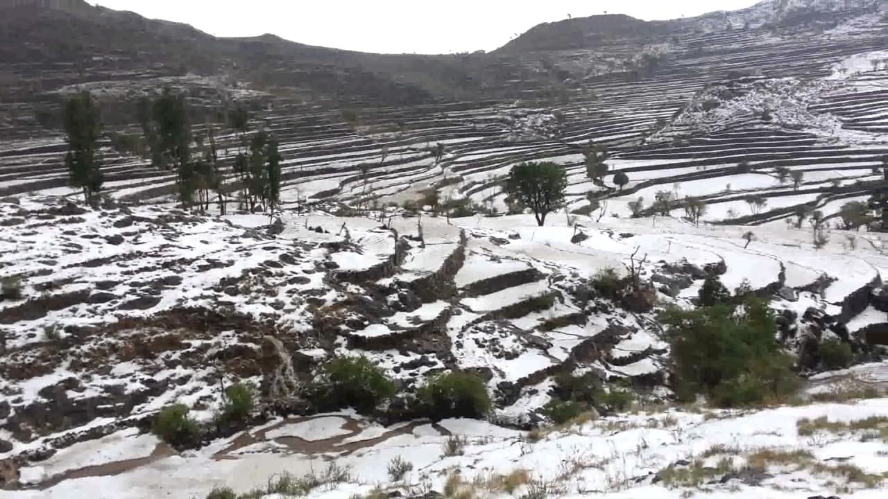بالصور .. الثلوج تكسو المدرجات الزراعية اليمنية بالثوب الأبيض