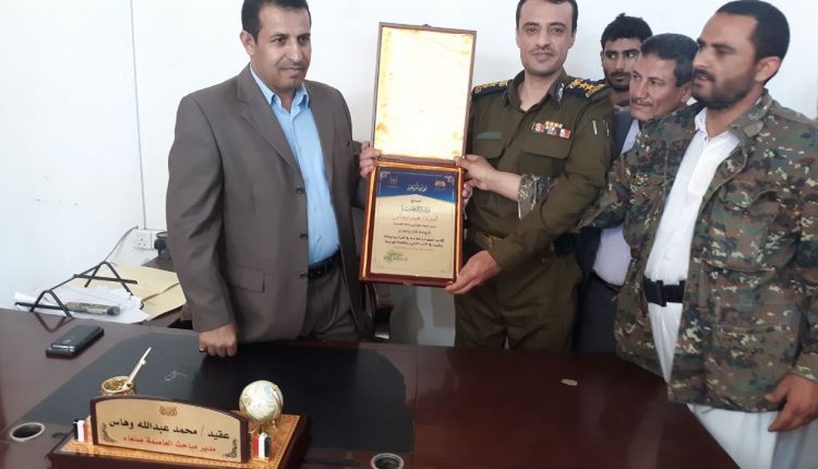 تنفيذا لتوجيهات وزير الداخلية اللواء عبدالكريم أمير الدين الحوثي، وبحضور الوكيل المساعد لخدمات الشرطة العميد عبدالكريم المخلافي، كرم مدير عام أمن أمانة العاصمة العميد الركن معمر صالح هراش، العقيد محمد وهاس مدير مباحث الأمانة، بشهادة شكر وتقدير صادرة من معالي وزير الداخلية، وذلك تقديرا لجهوده واخلاصه في أداء الواجب، وتميزه في العمل الأمني ومكافحة الجريمة.