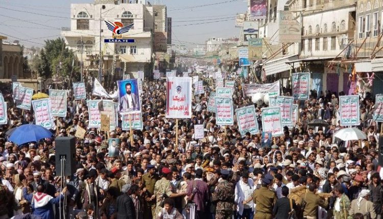 مسيرة جماهيرية بصعدة بعنوان “الحصار والعدوان الأمريكي جرائم إرهابية”