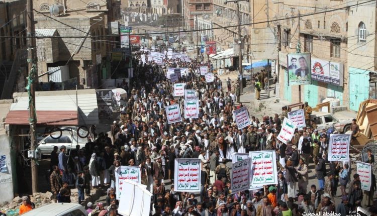 المحويت .. مسيرة جماهيرية حاشدة رفضاً للممارسات الإرهابية الأمريكية بحق الشعب اليمني