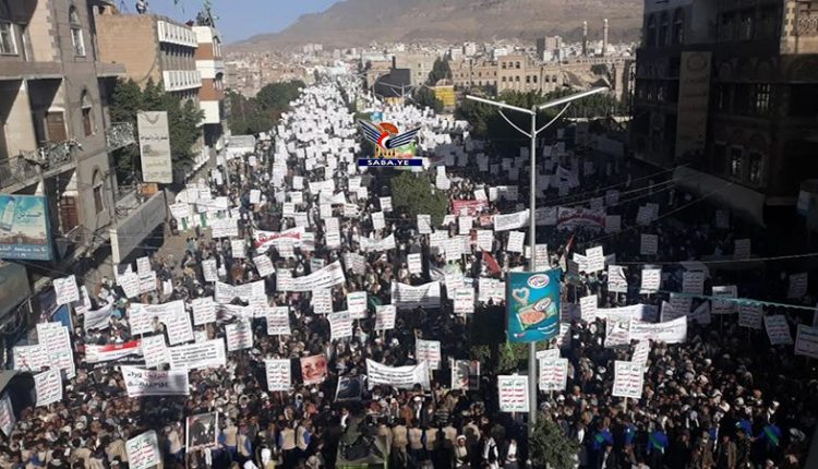 مسيرة جماهيرية كبرى بالعاصمة صنعاء رفضاً للإرهاب الأمريكي