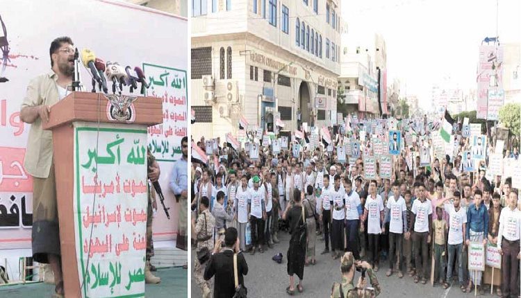 جرائم إرهابية ” -إلى أن الشعب اليمني شعب حر ومستقل وشجاع وأبي وها هو يحضر في كل الساحات رغم الألم والوجع والعدوان والحصار رافعا رأسه وأتى اليوم ليقول لقائد الثورة المباركة بايعناك ، عاهدناك ، فوضناك ، فاتخذ القرار الذي تشاء وكيف ما تشاء نحن إلى جانبك لا يمكن على الإطلاق ان تفصلنا عنك تصنيفاتهم ولا قراراتهم فالذي لم يستطع ان يفصلنا عنك بصواريخه وطائراته وحصاره لن يستطيع أن يفصلنا عنك بتصنيفه.