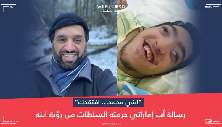 وقال المركز، ” أبني محمد، وسم أطلقه الناشط الإماراتي “أحمد الشيبة النعيمي” ليعبر فيه عن افتقاده لابنه “محمد” الذي يعاني من الشلل الدماغي بعد أن قامت السلطات الإماراتية بمنع ابنه من السفر لإجباره على العودة حتى يتسنى لهم اعتقاله”.