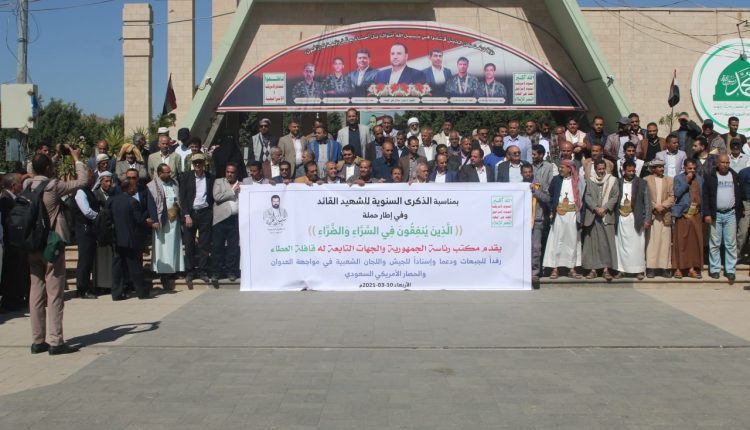 وجدد موظفو مكتب الرئاسة والهيئات والمؤسسات التابعة له في بيان تلاه نائب رئيس الدائرة الإعلامية عبدالقدوس الشهاري، التأكيد على وقوفهم إلى جانب الجيش واللجان الشعبية ومباركتهم للضربات النوعية في العمق السعودي والتي كان أخرها عملية الردع السادسة كحق مشروع للشعب اليمني في ظل استمرار العدوان والحصار.
