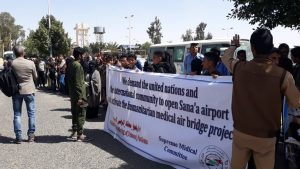 وخلال الوقفة الإحتجاجية دعت حملة النداء الإنساني لرفع معاناة المرضى اليمنيين في صنعاء، “الأمم المتحدة والمجتمع الدولي للتحرّك العاجل لفتح مطار صنعاء الدولي لإنقاذ حياة عشرات آلاف المرضى اليمنيين الذين هم بحاجة ماسّة للعلاج في الخارج”. مشيرة إلى أن مطار صنعاء هو مطار مدني والقوانين والأعراف الدولية لا تجيز إغلاقه، وإغلاقه جريمة حرب شارك فيها العالم بالصمت.