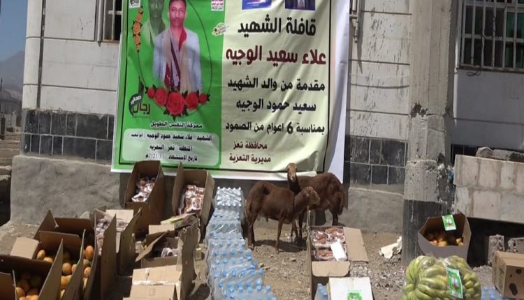سيرّت أسرة الشهيد علاء سعيد حمود الوجيه بمنطقة الشعبانية مديرية التعزية اليوم، قافلة غذائية دعماً لأبطال الجيش واللجان الشعبية المرابطين في الجبهات.