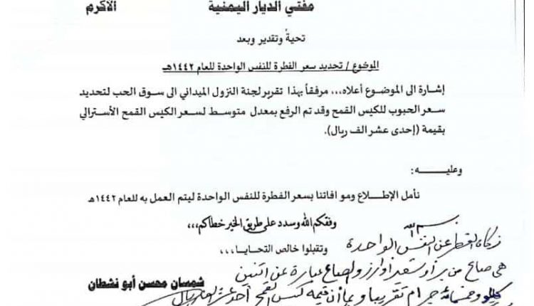 وكانت هيئة الزكاة قد ارسلت مذكرة في الـ 29 من شعبان 1442هجرية إلى مفتي الديار اليمنية تطلب تحديد سعر الفطرة للنفس الواحدة للعام 1442هجرية.