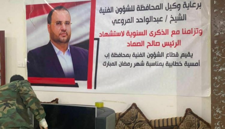 نظم قطاع الشؤون الفنية بمحافظة إب أمسية رمضانية إحياءً للذكرى السنوية لاستشهاد الرئيس صالح الصماد . تحت شعار ( الرئيس الصماد .. رجل المسؤولية).