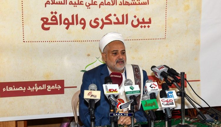 وأفاد بأن الإمام علي كرّم الله وجهه استشعر المسؤولية وواجه الطواغيت والظالمين وظل مدافعاً عن الدين الإسلامي والمستضعفين .. لافتاً إلى أن إحياء ذكرى استشهاده يأتي في إطار حاجة الأمة إلى بصيرة وحكمة الإمام علي وشجاعته وتضحيته في مواجهة الفكر التكفيري.