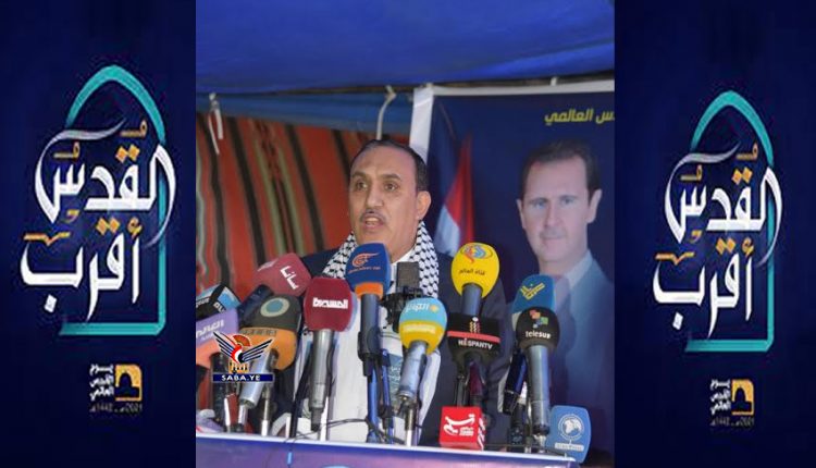وقال” إن صمود الشعبين اليمني والسوري وثبات أمة المقاومة في مواجهة المخططات الصهيو أمريكية دليل على أن تحرير القدس اليوم أقرب من أي وقت مضى لاسيما بعد أن تساقطت الأقنعة وتجلت الكثير من الحقائق وانكشف مستور العملاء والخونة الذين تاجروا بالقدس وفلسطين”.
