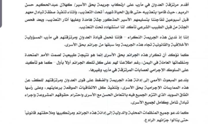 وأدانت اللجنة الوطنية لشؤون الأسرى هذه الجريمة النكراء .. محملة قيادة العدوان والمرتزقة في مأرب المسؤولية عن هذه الجريمة وماسبقها من جرائم بحق الأسرى.