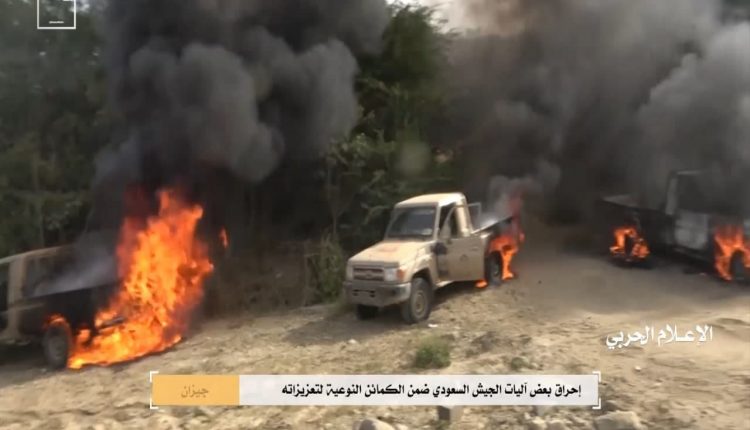 وأظهرت المشاهد الموثقة بالصوت والصورة لحظة قيام المجاهدين بإحراق عدد من الأطقم العسكرية والمدرعات السعودية بعد وقوعها في مصيدة كمائن محكمة ونوعية.