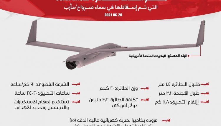 كشف الاعلام الحربي عن مواصفات الطائرة التجسسية الأمريكية Scan Eagle التي تمكنت قوات الدفاع الجوي من اسقاطها اليوم في مأرب .
