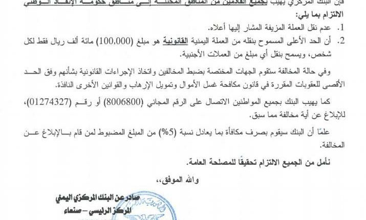 ويخص التعميم منع تسرب العملة المزيفة، وأن الحد المسموح بنقله من العملة اليمنية القانونية هو مبلغ (100000) مئة ألف لكل شخص.