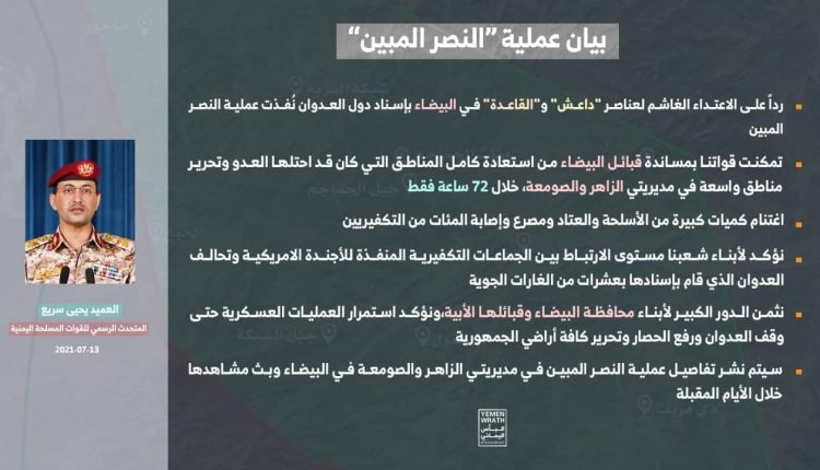 خسائر القاعدة وداعش في البيضاء أخبارأخبار محلية موجز مهول لخسائر العناصر التكفيرية في الصومعة والزاهر يمانيون// انفوجرافيك خسائر القاعدة وداعش في البيضاء Share