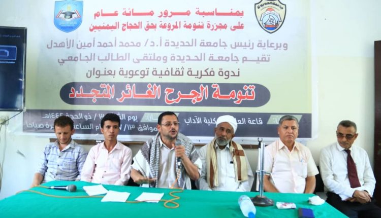نظمت جامعة الحديدة بالتنسيق مع ملتقى الطالب الجامعي اليوم ندوة فكرية ثقافية بعنوان ” تنومة الجرح الغائر المتجدد “ في ذكرى 100 عام على مجزرة تنومة بحق الحجاج اليمنيين.