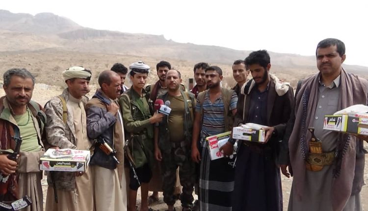 سير منتسبو مكتب التربية بمحافظة صنعاء اليوم قافلة عيدية للمجاهدين من أبطال الجيش واللجان الشعبية المرابطين في جبهات العزة والشرف والبطولة في مديرية مدغل بمحافظة مأرب..