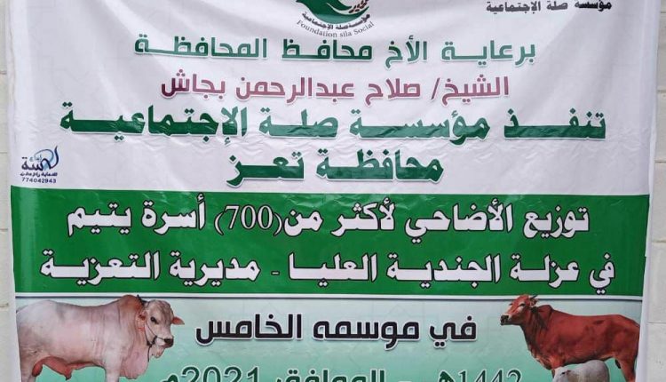 برعاية القائم بأعمال محافظ محافظة تعز الشيخ صلاح عبدالرحمن بجاش نفذت مؤسسة صلة الإجتماعية بمحافظة تعز صباح اليوم الاربعاء ثاني ايام العيد توزيع الأضاحي لأكثر من( 700) أسرة يتيم وأسر الشهداء في موسمها الخامس في عزلة الجندية العليا بمديرية التعزية.