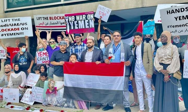 وندد المحتجون باستمرار أمريكا في دعم التحالف وتزويده بالأسلحة الذي يواصل التحالف حربه في اليمن.