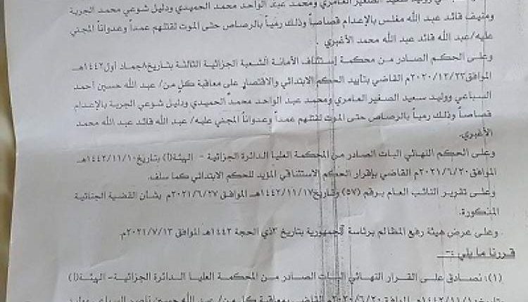 تحديد موعد تنفيذ اعدام المتهمين بقتل الأغبري