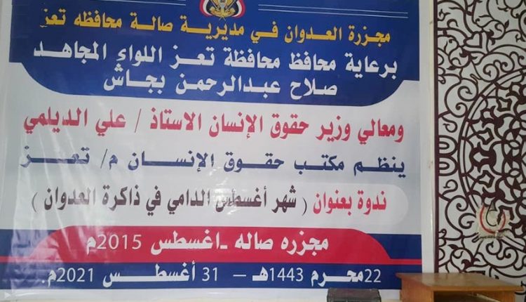 أحيا مكتب حقوق الإنسان بمحافظة تعز الذكرى السادسة لمجزرة صالة بندوة فكرية بعنوان ” شهر أغسطس الدامي 2015 في ذاكرة العدوان”.