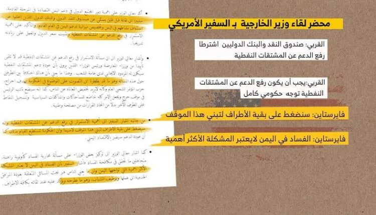 وفي الوثيقة قال السفير الأمريكي للقربي: “من المهم الدفع نحو رفع الدعم عن المشتقات النفطية وسنضغط على مختلف الأطراف لتبني هذا الخيار ولا سيما أن الحكومة تستطيع ذلك”.