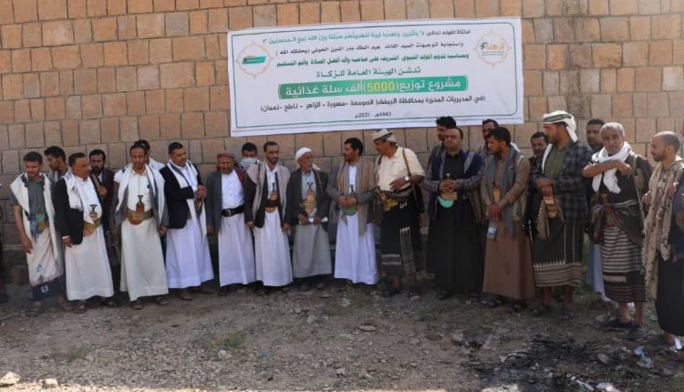 دشن فرع الهيئة العامة للزكاة بمحافظة البيضاء اليوم توزيع خمسة آلاف سلة غذائية للنازحين والفقراء والمتضررين من أبناء مديريات الصومعة ،الزاهر، نعمان، ناطع، مسورة.