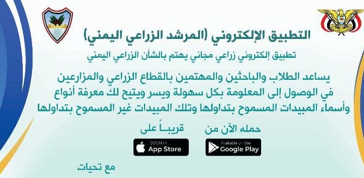 تدشن وزارة الزراعة والري غداً الاثنين خدمة الإرشاد الزراعي الإلكتروني، عبر تطبيق المرشد الزراعي اليمني.