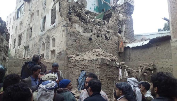 انهيار منزل بصنعاء القديمة متأثراً بغارات طيران العدوان على العاصمة