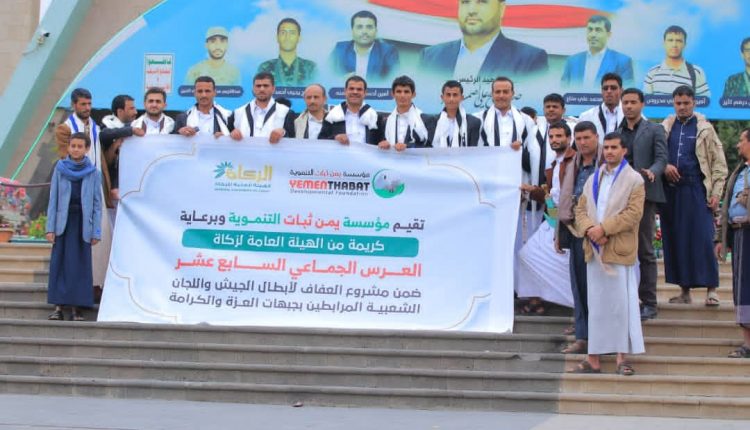 يمانيون- نظمت مؤسسة يمن ثبات التنموية بأمانة العاصمة، اليوم العرس الجماعي السابع عشر لـ ١٣ من المرابطين في الجبهات، بدعم من الهيئة العامة للزكاة ضمن مشروع العفاف.