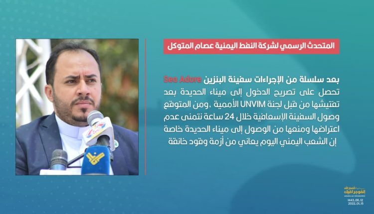 المتحدث الرسمي لشركة النفط اليمنية عصام المتوكل: بعد سلسلة من الإجراءات سفينة البنزين Sea Adore تحصل على تصريح الدخول إلى ميناء الحديدة