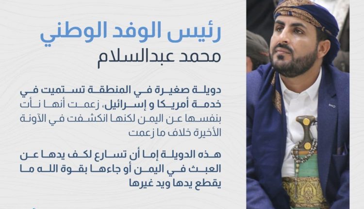رئيس الوفد الوطني محمد عبدالسلام: هذه الدويلة إما أن تسارع لكف يدها عن العبث في اليمن أو جاءها بقوة الله ما يقطع يدها ويد غيرها