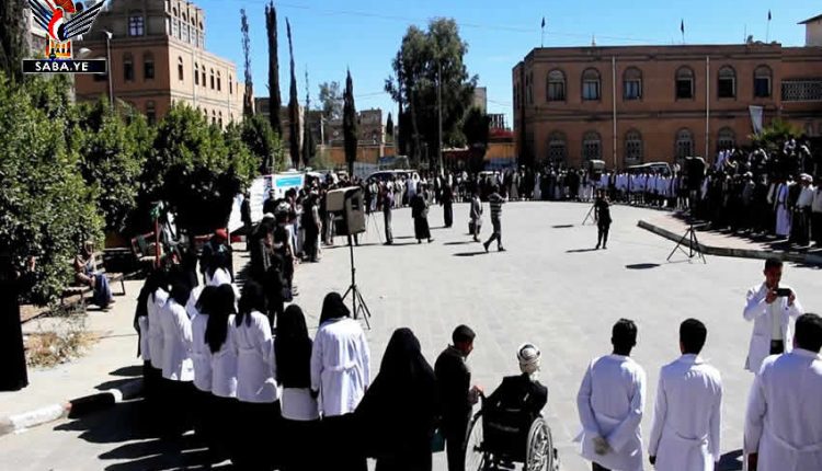 وخلال تقديم القافلة نظم منتسبو القطاع الصحي وقفة احتجاجية للتنديد بتصعيد تحالف العدوان في استهداف المنشآت الصحية والحيوية واستمرار الحصار ومنع دخول المشتقات النفطية.