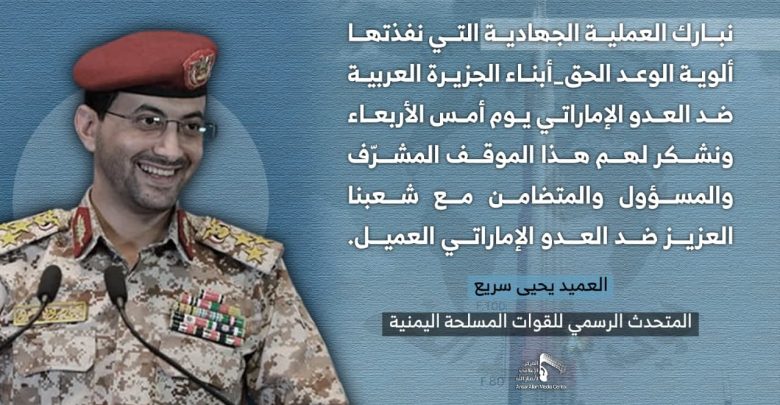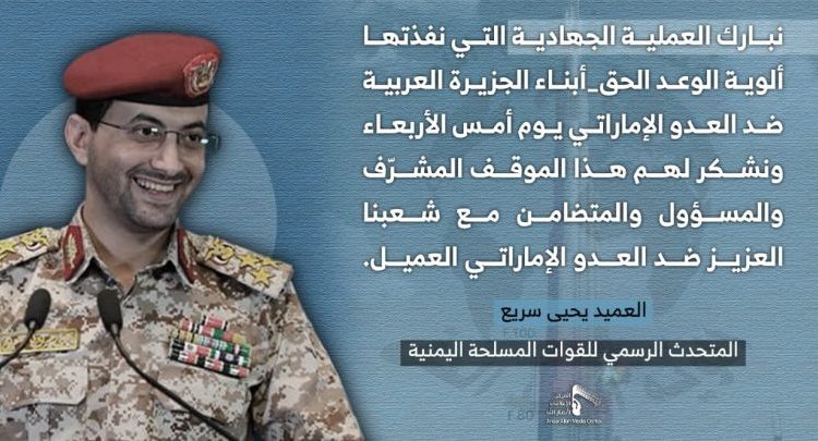 وقال المتحدث الرسمي للقوات المسلحة اليمنية العميد يحيي سريع في بيان له : نُبارِكُ العمليةَ الجهاديةَ التي نفّذتها ألويةُ الوعد الحق – أبناء الجزيرة العربية ضد العدوّ الإماراتي يوم الأربعاء، ونشكُرُ لهم هذا الموقفَ المشرِّفَ والمسؤولَ والمتضامِنَ مع شعبنا العزيز ضد العدوّ الإماراتي العميل”.