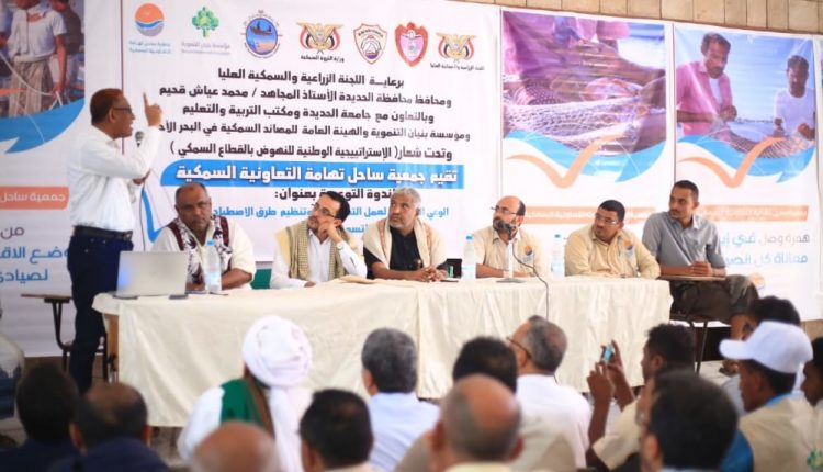 نظمت جمعية ساحل تهامة التعاونية السمكية بالتعاون مع جامعة الحديدة ومكتب التربية والتعليم والهيئة العامة للمصائد السمكية في البحر الأحمر ومؤسسة بنيان التنموية ندوة علمية حول الوعي المجتمعي بعمل التعاونيات وتنظيم طرق الإصطياد والتسويق السمكي تحت شعار “الاستراتيجية الوطنية للنهوض بالقطاع السمكي”.