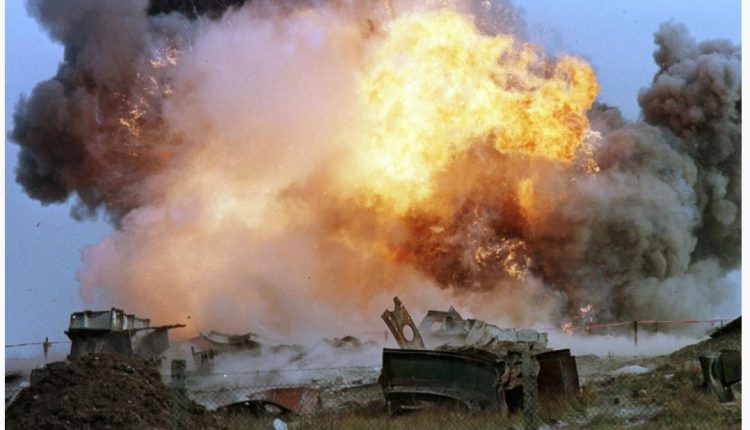 ألسنة اللهب تندلع من انفجار بعد تدمير صاروخ نووي SS-24 تم إيقاف تشغيله في قاعدة عسكرية في بيرفومايسك جنوب أوكرانيا في 29 سبتمبر 1998/ رويترز