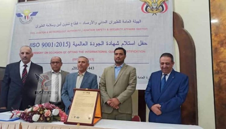 تسلمت الجمهورية اليمنية ممثلة بالهيئة العامة للطيران المدني والأرصاد – قطاع أمن وسلامة الطيران اليوم السبت، شهادة الجودة العالمية ISO 9001:2015 بتطبيق نظام إدارة الجودة بعد التدقيق عليها من “مجموعة الإدارة المستدامة – SMG – الكندية”.