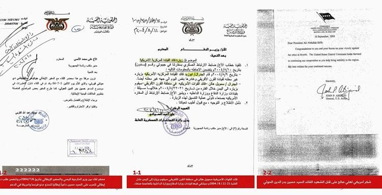 كما كشفت الوثائق، معلومات بطلب وزير الخارجية اليمني، من إيطاليا بتقديم الدعم للحرب على السيد حسين بدر الدين الحوثي أسوة بفرنسا وأمريكا، وكذا رسالة شكر موجهة من قائد القيادة الأمريكية يشكر فيها علي عبدالله صالح على قتل الشهيد القائد ودعوته إلى استمرار التعاون المشترك بينهما.