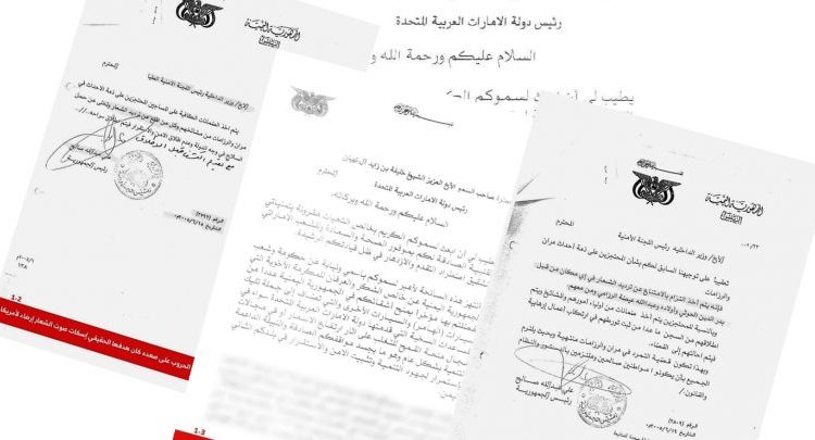 كما كشف هذه الوثائق عن رسالة وجهها علي صالح إلى خليفة بن زايد آل نهيان رئيس دولة الإمارات طلب فيها دعماً من الإمارات في الحروب على صعدة .