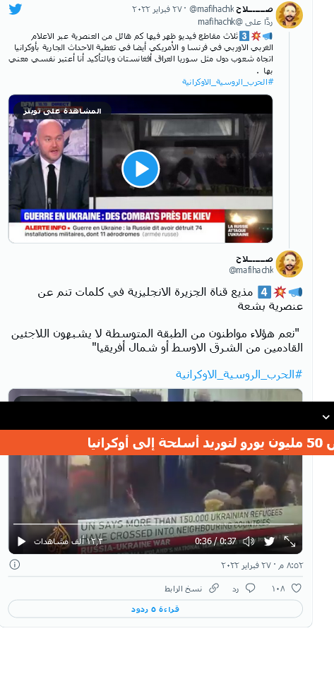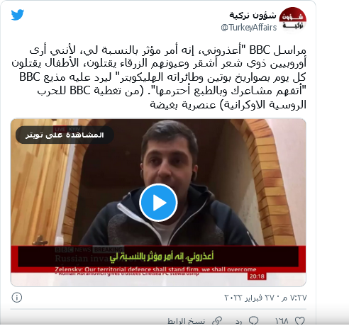 وقال أحدهم على قناة “بي بي سي”، خلال بث مباشر أيضا: “اعذروني أنه أمر مؤثر بالنسبة لي عندما أرى أوروبيون ذوي شعر أشقر وعيونهم زرقاء يقتلون”.